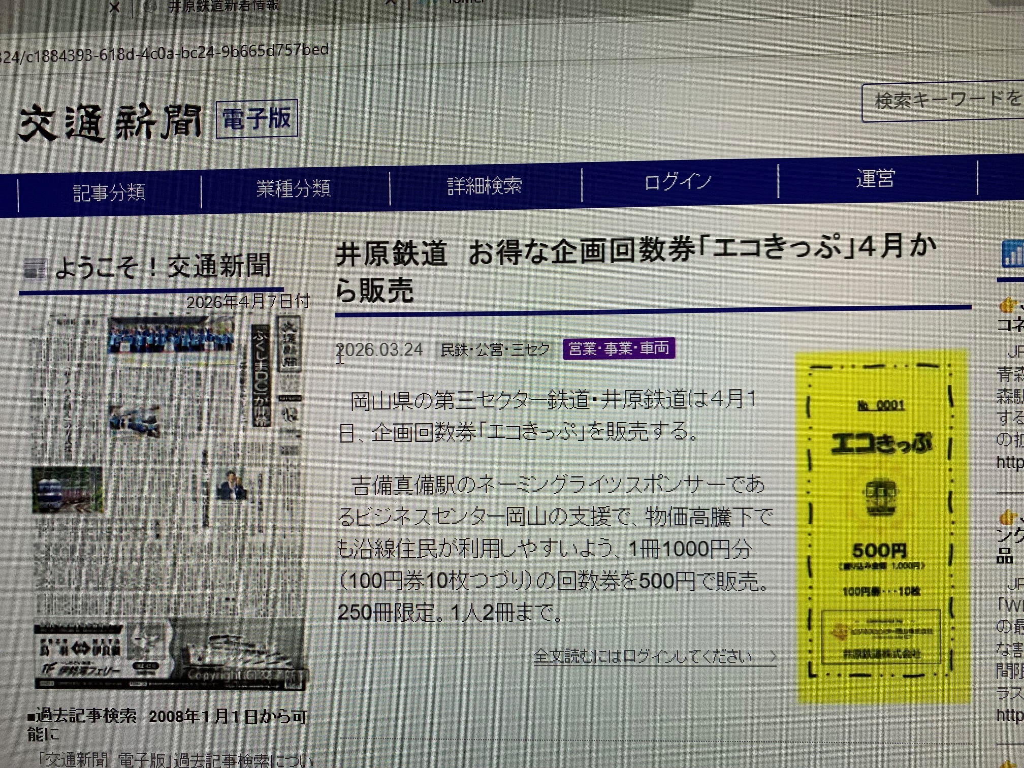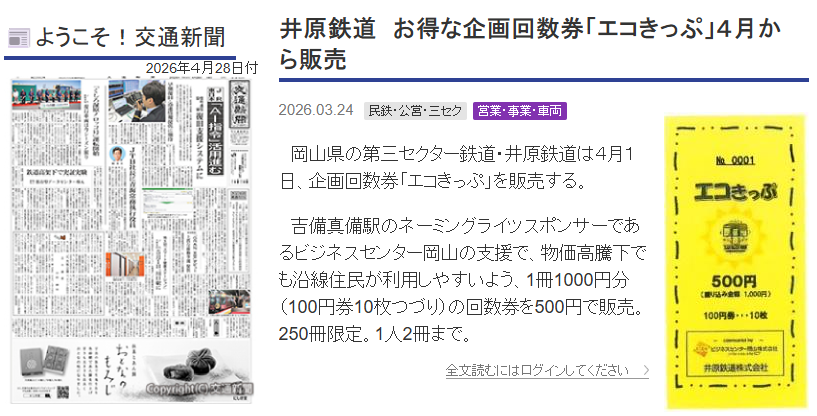 このたび、地域公共交通の利用促進を目的として、井原鉄道が販売する企画乗車券「エコきっぷ」が、当社の支援によりお得な価格で販売されることになりました。 「エコきっぷ」は、100円券10枚つづり(1,000円分)の乗車券を500円で購入できる回数券タイプのきっぷで、井原線を実質半額で利用できる大変お得な内容となっています。 当社では、地域の重要な公共交通である井原線の利用促進と、沿線地域の活性化に貢献…