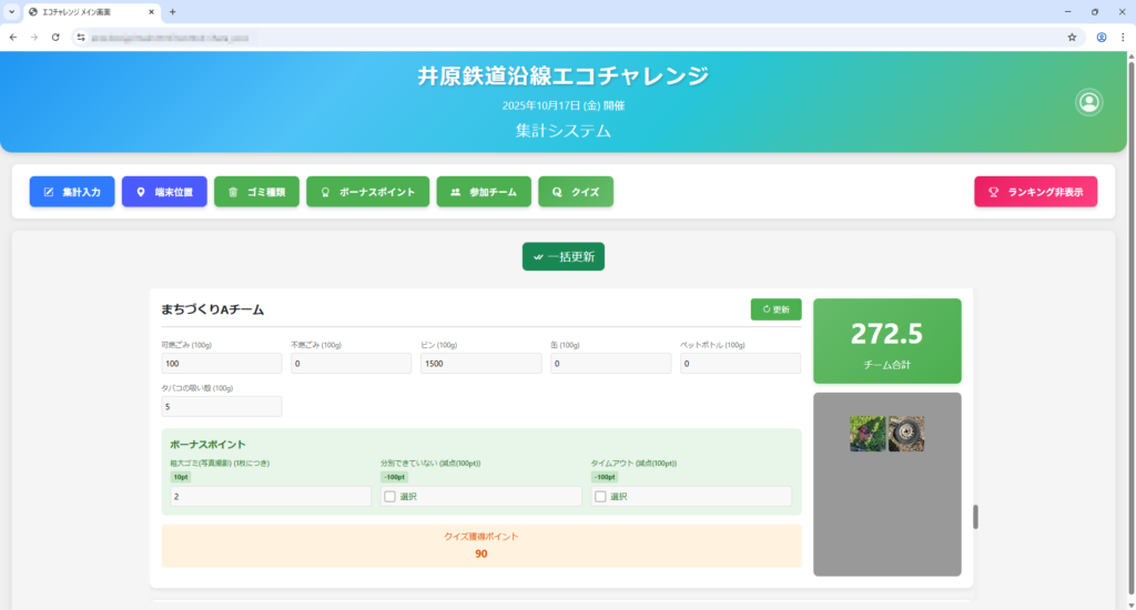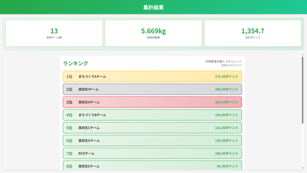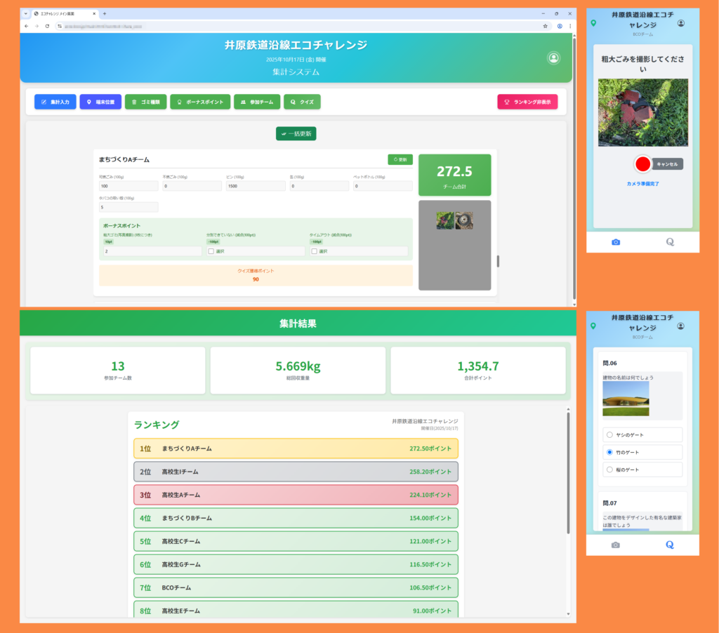 参加チームはアプリを起動させごみの報告や地域クイズへの回答を通じてポイントを獲得し、楽しみながら環境保全や地域学習に取り組むことができました。