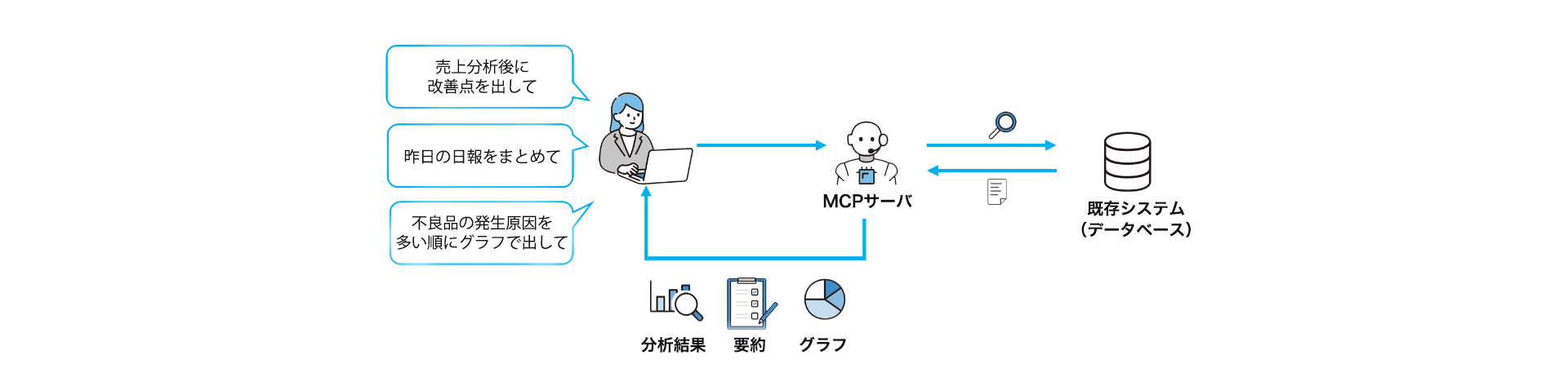 現在お使いのシステムを変える必要はありません。MCPサーバとつなげるだけで、すぐにAI活用が始められます。